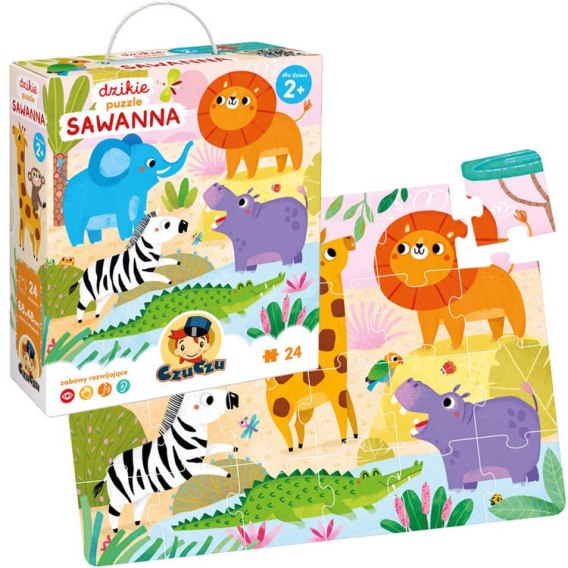 Duża, piękna ilustracja przedstawia znane i lubiane przez najmłodszych odkrywców dzikie zwierzęta z afrykańskiej sawanny. Kogo zaprosicie do wspólnej zabawy i puzzlowej podróży?