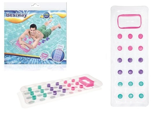 Materac to najbardziej popularny dodatek do wyjazdów nad wodę. Zaopatrz się więc w materac, który idealnie spełni Twoje oczekiwania i pomoże Ci się zrelaksować w wolnym czasie. Materac jest bardzo wygodny a dzięki swojej stelażowej budowie zapewni Ci odpowiednie dopasowanie do ciała. Zawarte w nim otwory mogą posłużyć Ci nawet jako uchwyt na napoje. Stworzony jest z wytrzymałego materiału PVC odpornego na uszkodzenia dzięki czemu nie będziesz musiał się martwić, że coś zepsuje Ci Twój odpoczynek.