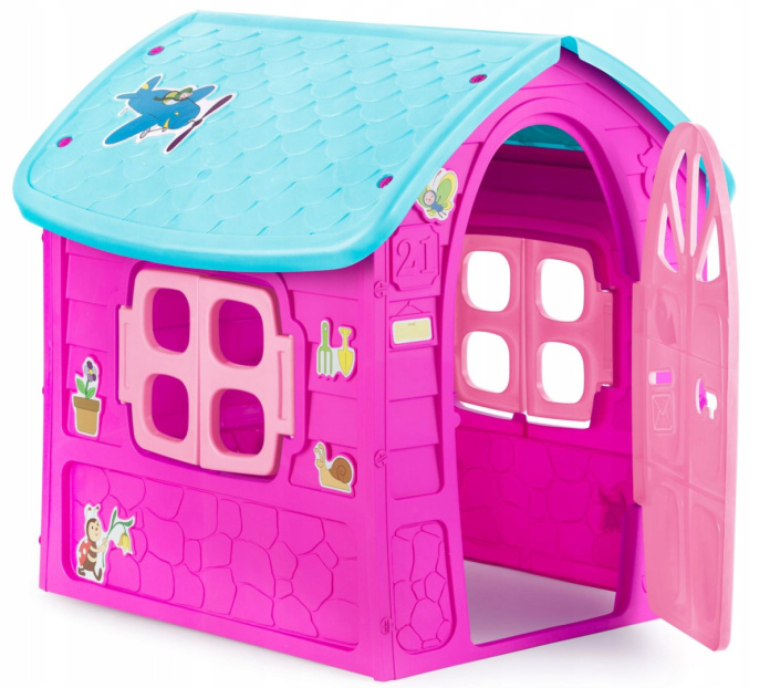Domek posiada 2 okna z otwieranymi okiennicami, otwierane drzwi wejściowe, okrągły bulaj z tyłu domku, oraz wejście dla naszego pupila. Całość dodatkowo ozdobiona jest kolorowymi naklejkami.