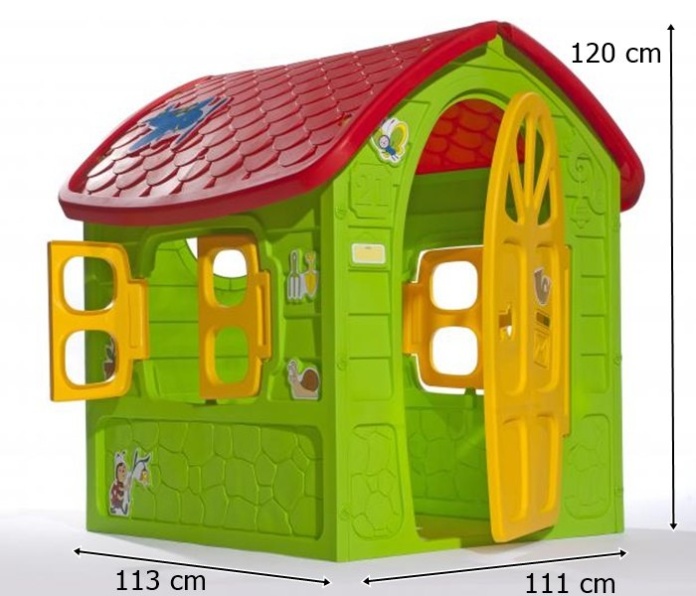Domek posiada 2 okna z otwieranymi okiennicami, otwierane drzwi wejściowe, okrągły bulaj z tyłu domku, oraz wejście dla naszego pupila. Całość dodatkowo ozdobiona jest kolorowymi naklejkami.