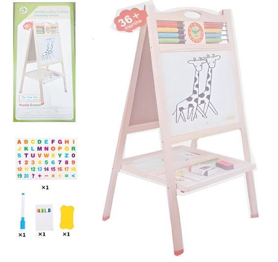 Duża drewniana tablica, to zabawka edukacyjna dla dzieci od 3 - go roku życia. Tablica jest z jednej strony biała magnetyczna, a z drugiej kredowa. Biała strona służy do pisania pisakiem znajdującym się w zestawie. Pisak posiada magnez, żeby go można było przyczepić do tablicy oraz gumkę do mazania. W górnej części tablicy znajduje się liczydło i zegar z przesuwanymi wskazówkami. Na kredowej stronie można malować kredą znajdującą się w zestawie, a potem wymazać wszystko gąbką. Zabawa z tablicą pozytywnie wpływa na zdolności manualne, koncentrację i wyobraźnię.
