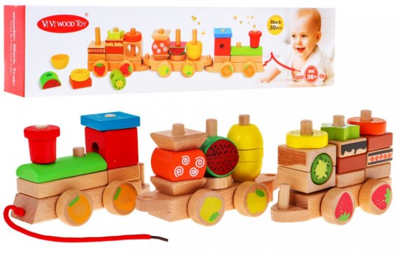 Drewniana lokomotywa z sorterami dla dzieci 3+ Zabawka sensoryczna + 27 klocków