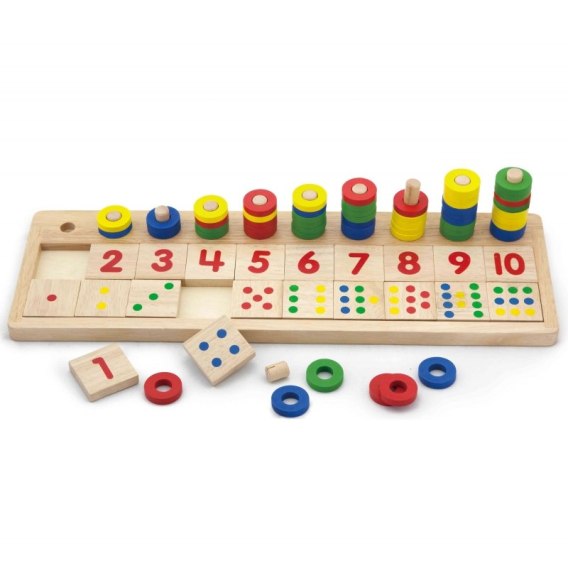 • - zestaw składa się z podstawki z 10 kołeczkami, na której umieszcza się krążki, klocki z numerami i kropkami,