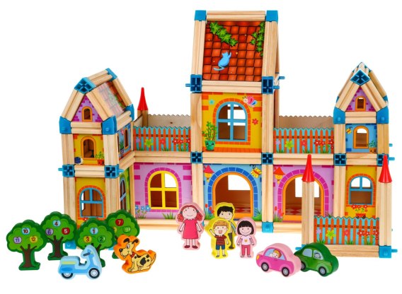 Zestaw drewnianych, kolorowych i bezpiecznych klocków dla dzieci od 3-go roku życia. Pakiet składa się z 268 elementów, które po ułożeniu tworzą kolorowe drewniane domki. Prócz elementów konstrukcyjnych w zestawie znaleźć możemy również klocki w kształcie drzewa, z postaciami czy autami, jest też obrazkowa instrukcja. |