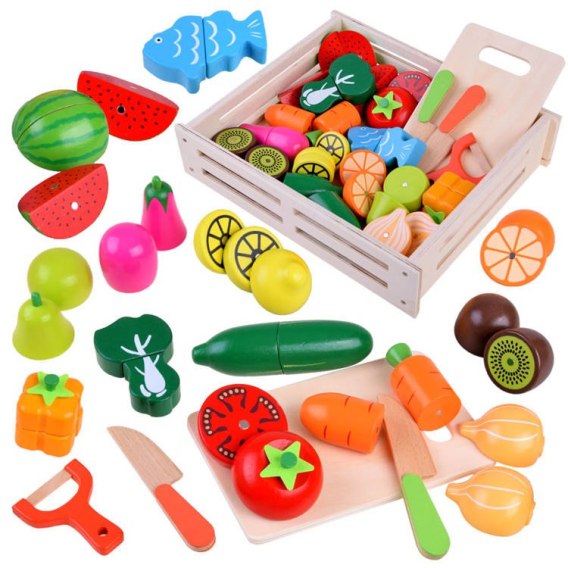 Drewniane warzywa i owoce do krojenia w naturalnej skrzynce z deską do krojenia i bezpiecznymi nożami. Zestaw naturalnie odwzorowanych warzyw, owoców i ryby zapewni kulinarne rewolucje. Dzieci uwielbiają naśladować dorosłych ich czynności codzienne, taki zestaw sprosta takim wyzwaniom. Warzywa, owoce mają zamontowane w swoich połówkach magnesy, dzięki czemu łatwo się rozpoławiają i dziecko może ćwiczyć rączki krojąc je na połówki, a arbuza nawet na ćwiartki. Świetny sposób na zachęcenie małych kucharzy do zabawy.