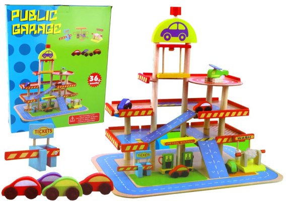 Parking składa się z trzech pięter, które pozwalają na przechowywanie i parkowanie drewnianych samochodów oraz helikoptera. Dzięki trzem poziomom, dzieci mogą organizować ruch i przemieszczać swoje pojazdy na różne piętra. Zestaw zawiera windę, która umożliwia przenoszenie samochodów między piętrami parkingowymi. To element, który rozwija zdolności manipulacyjne i koordynację ruchową dzieci. Cała zabawka jest solidnie wykonana z drewna, co zapewnia jej trwałość i stabilność podczas zabawy. Dzieci mogą eksperymentować z różnymi układami pojazdów i dodatkami bez obawy o zniszczenia.