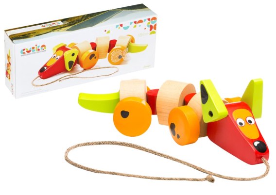 Drewniana zabawka uczy rozpoznawania kształtów i kolorów, rozwija motorykę oraz logiczne myślenie. Podczas ruchu zabawka zabawnie się porusza i przypomina ruch psa.