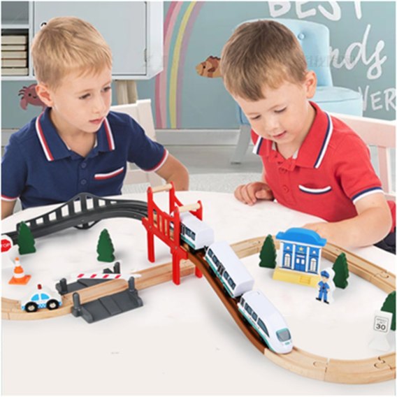 Drewniany tor dla dzieci z kolejką, mostem i mnóstwem wielu ciekawych elementów to propozycja dla dzieci od 3-go roku życia. Dokładnie oszlifowane elementy drewniane pomalowano nietoksyczną farbą, nie posiadają żadnych ostrych krawędzi i są w pełni bezpieczne dla dziecka. Zabawki drewniane są lekkie, trwałe, naturalne i odporne na uszkodzenia. Zestaw składa się z wielu elementów w tym np. pociągu, mostów, przejazdu kolejowego, drzew, posterunku policji z policjantem i autkiem policyjnym, czy też znaków drogowych. Z tym zestawem pociecha może tworzyć różne trasy dla pociągu. |