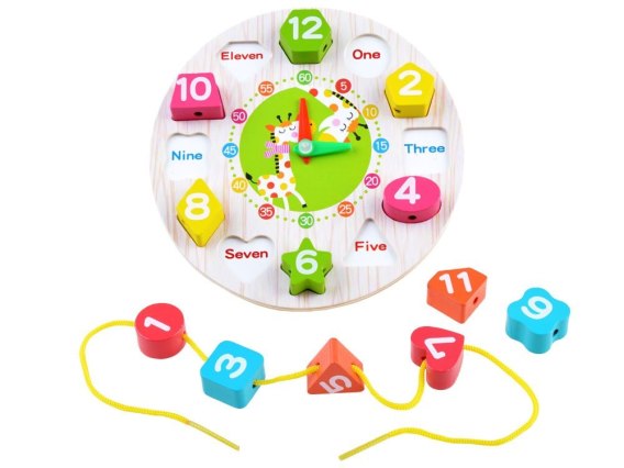 Zegar posiada okrągłą tarczę z przyjaznym rysunkiem zwierzątek. Na tarczy znajdują się dwie kolorowe wskazówki, oraz zaznaczone minuty. Cyfry godzin zostały usytułowane na kolorowych figurach, dzięki czemu dziecko podczas nauki czasu, będzie też oswajało się z kształtem figur, kolorami. Wieloelementowa zabawka pozwoli na edukacje podczas zabawy.