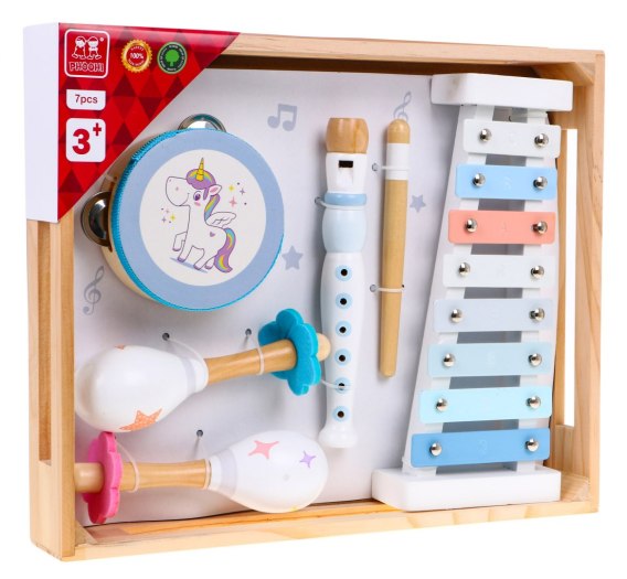 | Drewniany zestaw instrumentów to zabawka przeznaczona dla dzieci od 3-go roku życia. Doskonale rozwinie u dzieci słuch i poczucie rytmu. | |