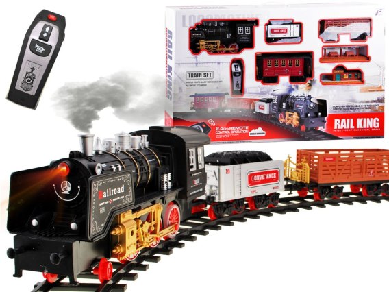 Kolejka została starannie dopracowana z dbałością o najmniejsze szczegóły, jest napędzana przez klasyczny parowóz wydający odgłosy pędzącej lokomotywy podczas jazdy. Dodatkowo nasza lokomotywa świeci ostrzegawczo światełkiem umieszczonym z przodu, a po napełnieniu zbiorniczka wodą z komina zacznie wydobywać się dym, jak przystało na starodawny parowóz. Natomiast podczas jazdy wydaje odgłosy, a typowe dla pędzącego pociągu gwizd, stukotanie kół o tory, bicie w dzwon itp. odgłosy dla pociągu. Ten wspaniały model kolejki z wagonami z pewnością ucieszy każdego początkującego fana modeli kolejek.