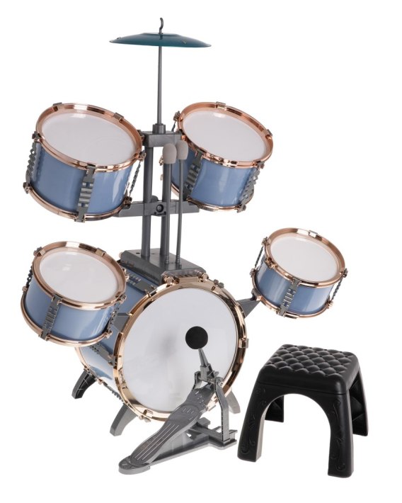 - bęben duży z pedałem do uderzania, - 2 x średni bęben, - 2 x mały bęben, - talerz metalowy, - 2 x pałeczka, - stołek. |