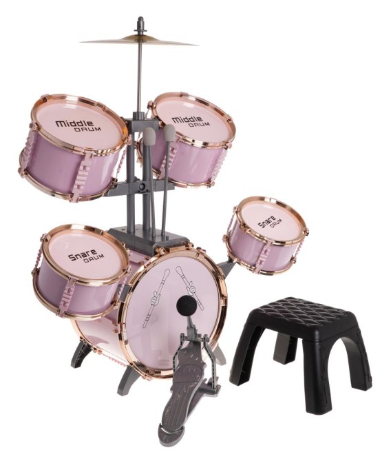 Duża, różowa perkusja z krzesełkiem w zestawie to zabawkowy instrument dla dzieci od 3 - go roku życia. Zestaw zawiera 5 bębnów, talerz metalowy, 2 pałki oraz krzesełko. |