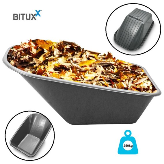 ZAPASOWA MISA WANNA KORYTO DO TACZKI PVC 100L BITUXX Oferujemy Państwu solidną, plastikową misę do taczki o pojemności 100 litrów, udźwig do 250kg. Wanna wykonana jest z PVC o grubości około 3mm. Miska do taczki to niezbędny sprzęt, który z biegiem czasu może się zniszczyć poprzez wrzucanie do nich ostrych kamieni, czy też innych przedmiotów.