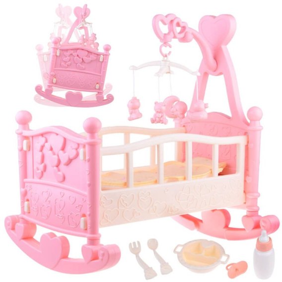 Kołyska została wykonana w całości z plastiku, z wytłaczanymi wzorami serduszek, posiada karuzelę , która jest w zestawie, oraz akcesoria do karmienia niemowlaka. Pełen kompaktowy zestaw sprawdzi się w każdym małym pokoju dziecięcym. Dzięki temu iż kołyska jest długa zmieści się w niej lalka, miś ze wzrostem do 42cm! Atutem kołyski są ściągane płozy dzięki temu w łatwy sposób kołyskę zamienisz w łóżeczko.