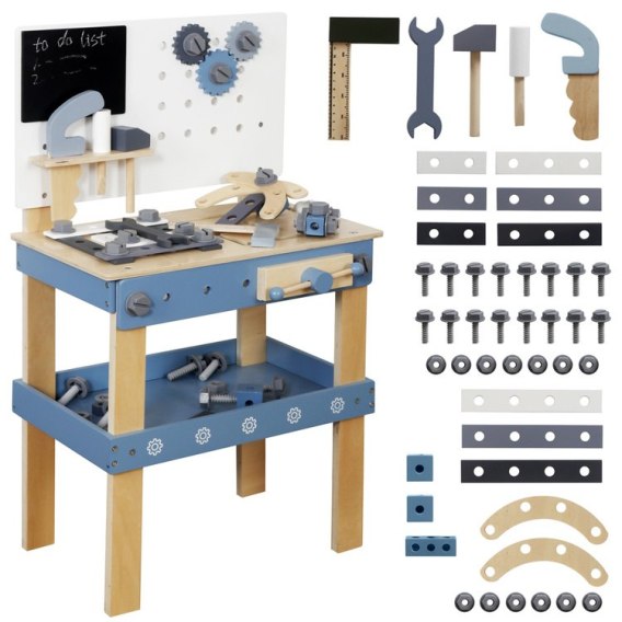 Ten drewniany warsztat to idealna zabawka edukacyjna dla małych majsterkowiczów. Zestaw został zaprojektowany z myślą o rozwijaniu umiejętności manualnych oraz wyobraźni u dzieci, a także wprowadzaniu ich w świat narzędzi i majsterkowania. Wykonany z solidnego drewna, warsztat jest trwały, bezpieczny i estetyczny, a jego naturalne kolory w połączeniu z niebieskimi akcentami przyciągną uwagę każdego dziecka.