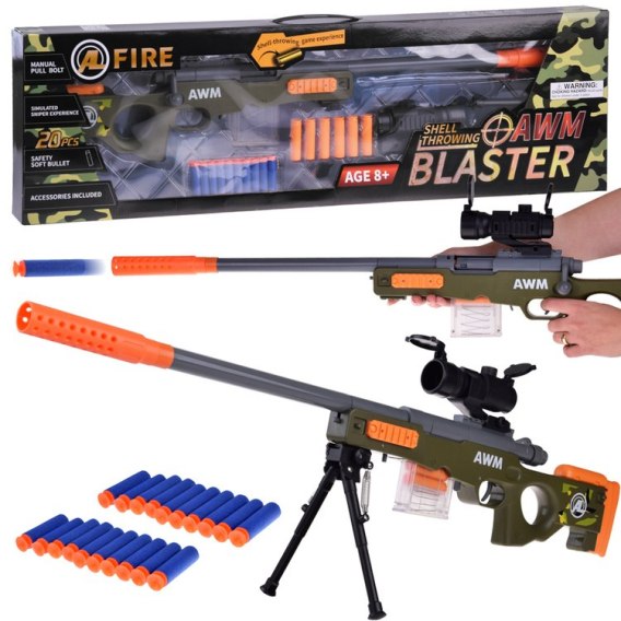 Duży karabin snajperski na naboje piankowe to propozycja dla niejednego miłośnika militariów. Karabin wyposażony został w lunetę, wyciągany magazynek, naboje piankowe, które umieszczamy w tzw. łuskach. Po każdym przeładowaniu, z komory wypada łuska jak w prawdziwym karabinie, dzięki czemu zabawa staje się bardziej realistyczna. Celny strzał na odległość, ułatwi luneta, która przybliży i zapewni przejrzysty obraz (można ją przybliżyć lub oddalić przesuwając pokrętło znajdujące się w górnej części lunety). Karabin nie wymaga żadnych baterii posiada naciąg mechaniczny, który zapewnia wygodne użytkowanie wystarczy pociągnąć uchwyt naciągu, aby przeładować magazynek. W górnej części karabinu oraz na chwycie przednim umieszczono szyny, do których przymocować można niezbędne akcesoria: lunetę oraz dwójnóg. W magazynku mieszczą się cztery naboje piankowe umieszczone w łuskach. Magazynek możemy wyciągnąć za pomocą przycisku znajdującego się obok magazynku przesuwając go w jego stronę. Po wciśnięciu przycisku z przodu magazynku możemy odpiąć stację przeładunku zaś za pomocą przycisku z przodu karabinu możemy odpiąć lufę karabinu. Karabin został wykonany w całości z plastiku, dzięki czemu jest lekki. To wszystko sprawia, że mały wojskowy szybko się nie zmęczy i zabawa będzie mogła długie godziny.