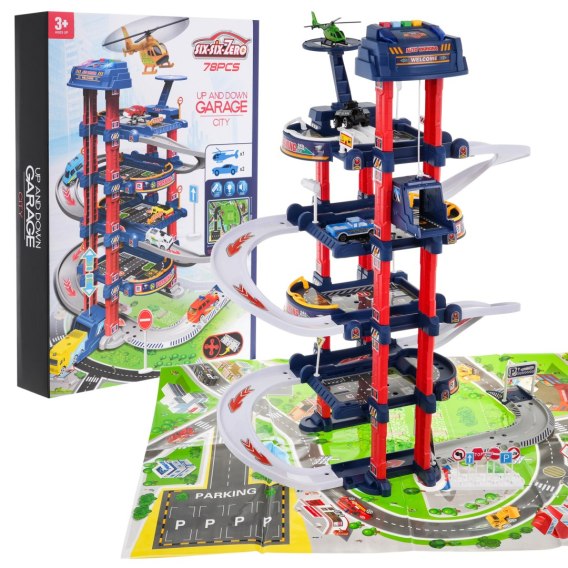 Duży interaktywny parking z elektryczną windą, torem dla autek i matą z drogami to propozycja dla dzieci od 3-go roku życia. Parking posiada wiele poziomów, na które można dostać się za pomocą elektrycznej windy. Każdy z poziomów połączony jest z innym zjeżdżalnią dla resoraków. Na górze garażu znajduje się panel z kolorowymi przyciskami, obsługujący windę. Czerwony guziczek opuszcza windę w dół, a żółty wyciąga ją w górę. Po wciśnięciu niebieskiego przycisku usłyszymy odgłosy charakterystyczne dla policji, straży pożarnej, karetki, a także strzelanie i odpalanie samochodu. Zielony przycisk po naciśnięciu wydaje odgłosy klaksonu. Na panelu sterowania windą migają się również niebieskie i czerwone światełka.