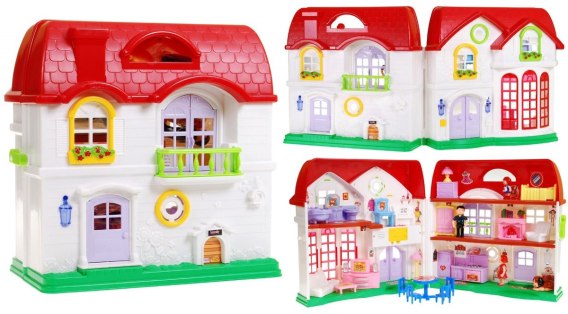 | - rozkładany, piętrowy domek - willa, - 4 figurki mieszkańców - Mama, Tata, Dziecko i Piesek, - 23-częściowy komplet mebli do salonu, jadalni, łazienki, kuchni i innych pokoi składający się z: - wanny, - szafki z umywalką, - toalety, - ławy, - kominka, - sofy, - fotela, - pianina, - stołu z krzesłami, - łóżka, - komody, - szafy na ubrania, - szafki pod telewizor, - lodówki - lampki nocnej, - lampy stojącej, - toaletki, - zestawu kuchennego |