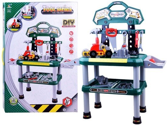 Warsztat wyposażony w blat roboczy z centymetrem, półki, haczyki do zawieszania narzędzi, pozwoli każdemu małemu mechanikowi na utrzymanie porządku w swoich narzędziach.