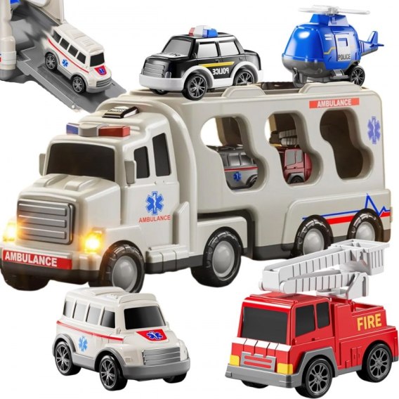 Duży Zestaw Ratunkowy Ciężarówka+4 Auta od Marki Woopie Zaprojektowana z myślą o małych pasjonatach straży pożarnej, policji,pogotowia ta zabawka 5 w 1 to idealny zestaw dla każdego małego ratownika! Naciśnij przycisk na górze kabiny ciężarówki, aby zobaczyć jasne migające światła i usłyszeć realistyczne syreny, bardzo atrakcyjne dla dzieci. Zestaw zawiera dużą ciężarówkę transportową oraz cztery pojazdy ratunkowe: samochód strażacki, radiowóz, helikopter policyjny, karete. Każdy z pojazdów ma ruchome elementy, które pozwolą Twojemu dziecku poczuć się jak prawdziwy bohater podczas akcji ratunkowych! Zestaw jest świetnym pomysłem na prezent urodzinowy, świąteczny czy na inne okazje.