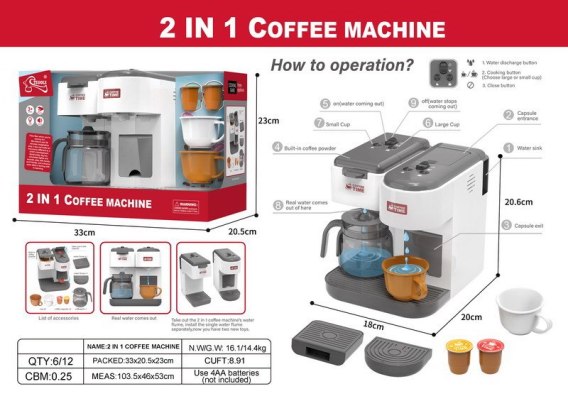 Interaktywny zestaw 2 w 1, zaparzacz do kawy z ekspresem na kapsułki i akcesoriami dla dzieci powyżej 3-go roku życia. Zabawka łączy w sobie dwa urządzenia, które możemy używać jednocześnie, lub odłączyć je od siebie i bawić się nimi osobno. Zaparzacz do kawy posiada otwieraną szufladkę na kawę, otwierany pojemnik na wodę oraz 3 przyciski: do zaparzenia małej kawy, dużej oraz przycisk do uruchomienia funkcji wody. Podczas zaparzania kawy słychać odgłosy oraz mruga czerwone światełko przy wylocie z wodą. Ekspres kapsułkowy posiada otwierany pojemniczek na kapsułki, pojemniczek na wodę oraz przyciski do zaparzania małej i dużej kawy. Podczas parzenia identycznie jak w zaparzaczu do kawy słychać odgłosy parzenia i mruga czerwone światełko przy wylocie z wodą. Zabawka zasilana jest bateriami typu 4 x AA 1,5 V (brak w zestawie). Funkcje zestawu: - odpowiedni dla dzieci powyżej 3-go roku życia, - wykonany z najlepszej jakości plastiku, - realistyczny wygląd, - funkcja lejącej się wody, - odgłosy zaparzania kawy, - mrugające światełko przy wylocie wody z zaparzacza i ekspresu, - zestaw 2 w 1 zaparzacz do kawy i ekspres kapsułkowy, - ekspres i zaparzacz można połączyć w jedno lub bawić się nimi osobno, - liczne akcesoria w zestawi. |