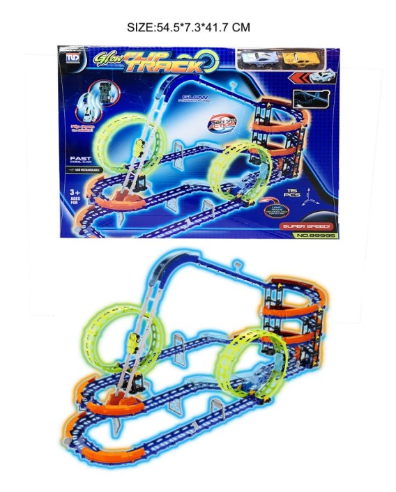 Duży, wielopoziomowy tor wyścigowy z drabinką, ostrymi zakrętami, pętlami i autkami to propozycja dla dzieci od 3-go roku życia. Zestaw składa się z 116 elementów do samodzielnego montażu i zawiera odcinki proste, ostre zakręty z barierkami zabezpieczającymi przed wypadaniem pojazdu z trasy, dwie pętle 360 stopni i drabinkę. Pętle dodatkowo są fluorescencyjne, świecą w ciemności. Pojazdy dołączone do zestawu są bardzo szybkie, od spodu posiadają podświetlane. Zasilane są akumulatorem 3,7 V, akumulator znajduje się w pojazdach. |