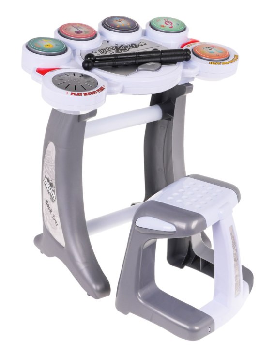 Perkusja elektroniczna na stojaku z 5 padami i krzesełkiem to propozycja dla dzieci od 6-go roku życia. Zestaw idealnie sprawdzi się dla początkujących perkusistów. Perkusja posiada pięć padów, na których możemy wybić 6 rytmów bębnowych. Wyposażona została również w 5 demo melodii, przycisk regulacji głośności i resetowania. Perkusja zasilana jest bateriami typu 3 x 1,5V AA, baterii brak w zestawie.