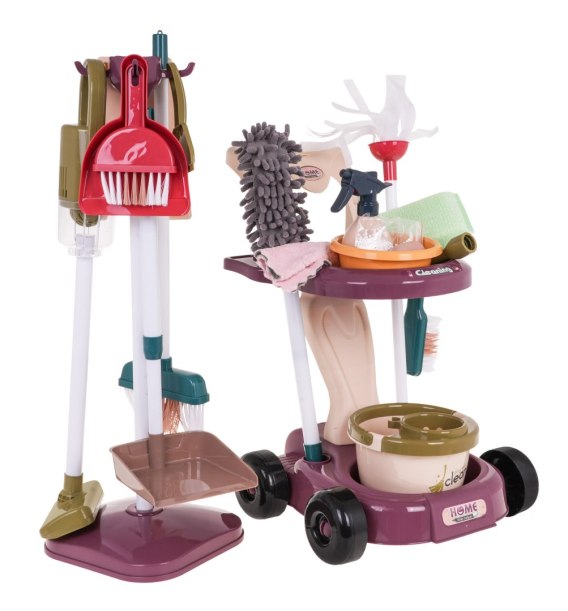 Duży, bogato wyposażony zestaw sprzątający z wózkiem, stojakiem, odkurzaczem pionowym i akcesoriami to propozycja dla dzieci od 3-go roku życia. Zestaw zawiera aż 26 elementy. Wózek posiada kółeczka, wygodną rączkę do pchania oraz dwie półeczki do przechowywania akcesoriów. Odkurzacz pionowy wyposażono w dwie wymienne ssawki takie jak szczotkę i ssawkę szczelinową. Zasilany jest bateriami typu 3 x AA 1,5V, baterii brak w zestawie. Po włączeniu wydaje odgłosy odkurzania i wciąga drobne kuleczki styropianowe. Niektóre akcesoria takie jak zmiotka z kijem i szczotka są regulowane. Pojemniczek ze spryskiwaczem można uzupełniać wodą.
