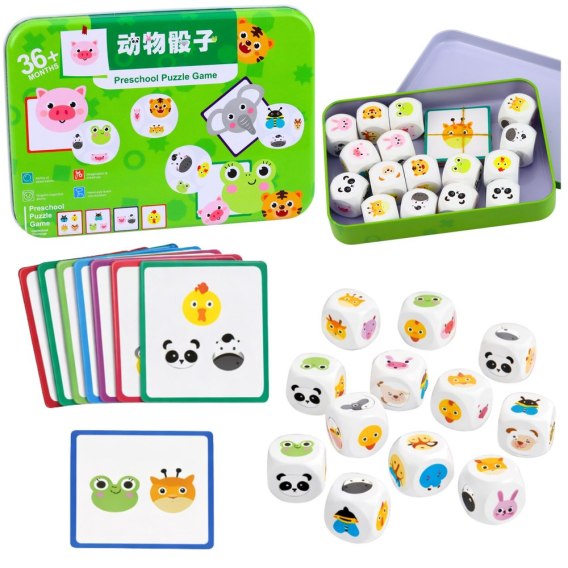 Gra edukacyjna z kostkami ze zwierzątkami to ciekawa zabawka rozwijająca logiczne myślenie oraz zdolności poznawcze dziecka. Zestaw polega na dopasowywaniu obrazków zwierząt poprzez odpowiednie ułożenie kostek według wzoru przedstawionego na kartach. Dziecko losuje kartę z ilustracją zwierzątka, a następnie obracając kostki stara się ułożyć taki sam obrazek jak na karcie.
