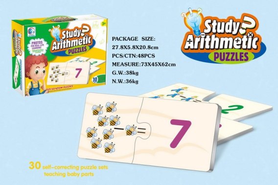 Gra edukacyjna, matematyczna Liczenie dla dzieci od 3-go roku życia. Gra składa się z 30 puzzli, dzięki którym dziecko uczy się liczyć i dopasowywać kształty. Gra trenuje również koordynację ręka-oko, rozwija spostrzegawczość i koncentrację. Z jednej strony mamy zadanie matematyczne w postaci rysunków różnej ilości rzeczy i działania matematycznego np. 8 pszczółek odjąć 1 pszczółka. Z drugiej strony, dziecko musi przypasować puzzel z cyfrą arabską odpowiadającą równaniu po lewej stronie. Funkcje gry: - odpowiednia dla dzieci powyżej 3-go roku życia, - 60 elementów, - możemy ułożyć 30 plansz, - solidne wykonanie, w żywych kolorach, - uczy koncentracji, - uczą dopasowywać kształty, - korzystnie wpływają, ma naszą pamięć wzrokową, - uczy nazywać rzeczy, - uczy rozpoznawać kolory, - uczy rozwiązywać zadania matematyczne w zakresie 1-10. |