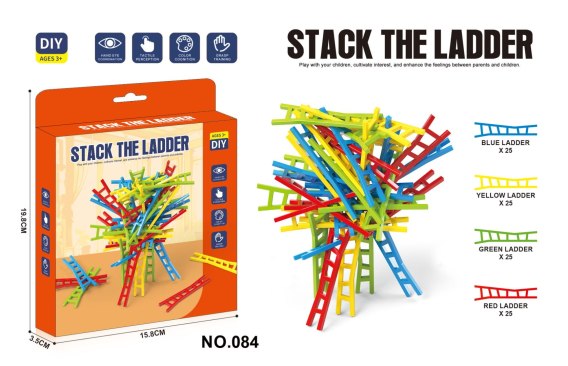 Zręcznościowa gra drabiny dla dzieci od trzeciego roku życia. Gra wykonana została z najlepszej jakości tworzywa sztucznego w żywych kolorach. Na zestaw składa się 100 drabin w 4 kolorach. Zasady gry są bardzo proste, należy ułożyć wieżę z drabin i nie zrzucić żadnej z drabin. Dodatkowym utrudnieniem jest to, że drabiny nie są proste, ale posiadają wykrzywione formy. Grać można samodzielnie lub maksymalnie w 4 osoby. Każdy z graczy wybiera kolor drabinek i próbuje ułożyć je wszystkie. Gracze na przemian układają drabinki, do momentu przewrócenia wieży. Przegrywa gracz, który przewróci drabinę. Ważną zasadą jest to by przy pierwszym rozdaniu układać drabiny w pozycji pionowej a kolejne już dowolnie.