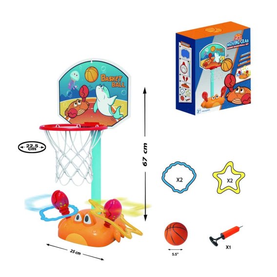 - gra ok. 32 cm x 69 cm x 30 cm, - wysokość kosza do podłoża ok. 44 cm, - średnica kosza ok. 22,5 cm, - piłka o średnicy ok. 11 cm, - obręcze z gwiazdką ok. 18 cm średnicy, - obręcze w kształcie muszli ok. 17,5 cm x 15,5 cm, - opakowanie ok. 28,5 cm x 34 cm x 12 cm. |