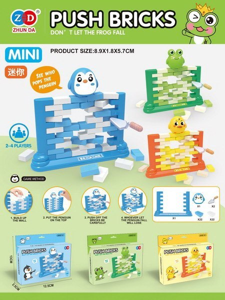 Gra zręcznościowa Ściana dla dzieci od 3-go roku życia. Gra polega na zbudowaniu ściany z klocków na specjalnie do tego przeznaczonej podstawce, a następnie wypychaniu z muru poszczególnych cegiełek, specjalnie do tego przeznaczoną kielnią. Na górze muru znajduje się figurka żabki, musimy uważać, by nie spadła. Wygrywa ten, który wypychając cegły, nie spowoduje zawalenia się muru i upadku żabki. W grę możemy grać samodzielnie, lub w więcej osób. Gra uczy koncentracji, logicznego myślenia, poprawia koordynację ręka-oko.