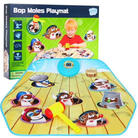 | Zabawna, wciągająca gra rodzinna dla małych i dużych, rozwijająca zręczność i koordynację ruchową. Gra składa się z planszy, na której umiejscowionych jest siedem moli. Każdy z moli ma lampkę na nosie. Gracz powinien użyć młotka (w zestawie) do uderzenia mola, ilekroć zaświeci się lampka na jego nosie. W górnej części maty znajduje się ekran LCD, wyświetlający wyniki. Gra posiada 3 poziomy. W pierwszym poziomie gracz musi zdobyć 20 z 30 punktów, aby przejść poziom. W drugim poziomie prędkość jest większa, gracz musi zdobyć 60 z 65 punktów. W trzecim poziomie prędkość jest większa niż w drugim a gracz musi zdobyć 95 na 100 punktów. Gra przeznaczona jest dla dzieci od trzeciego roku życia. Zasilana jest bateriami typu AA (3x1,5V - brak w zestawie). |