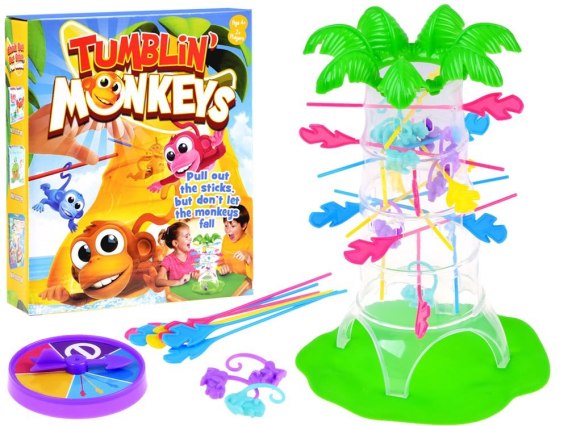 Bardzo popularna gra zręcznościowa Fikające Małpki to świetna propozycja zabawy dla najmłodszych. Gra dostarczy mnóstwo frajdy i radości. Jest łatwa do nauczenia i zabawna. Wymaga zręczności, koncentracji i umiejętności logicznego myślenia. Gra Fikające Małpki to wapniały sposób na spędzenie wspólnie czasu. Polega na tym, aby umieścić patyczki w otworach palmy i wsypać od góry małpki tak aby pozaczepiały się ogonkami na patyczkach. Następnie gracze kręcą po kolei strzałką i losują kolor kolor patyczka, którym mają wyciągnąć. Trzeba przy tym uważać, aby nie spadła ani jedna małpka. Wygrywa ten kto zbierze najmniej małpek! POWODZENIA!