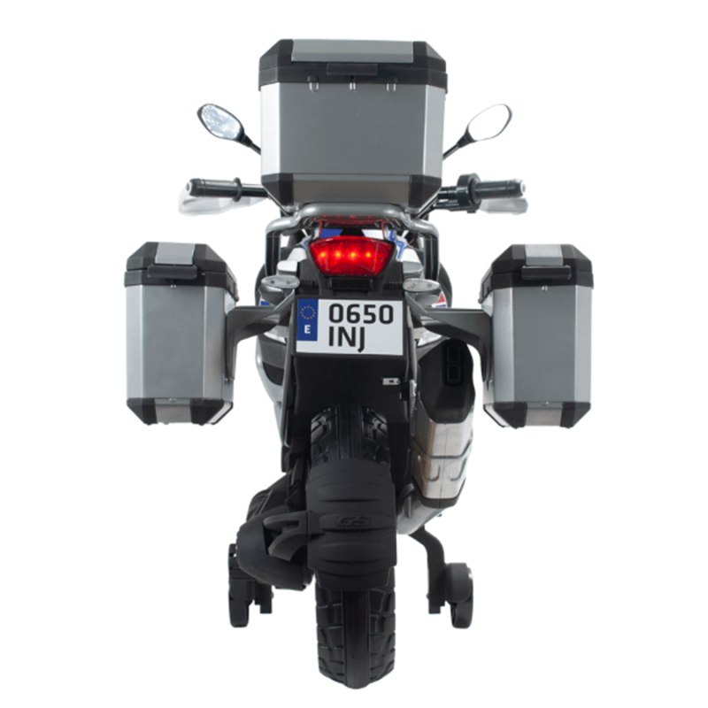 Motocykl BMW 1250 GS Adventure na akumulator 12V cenionej marki INJUSA posiada oficjalną licencję BMW i jest zalecany dla dzieci od 3 roku życia. Wśród jego głównych cech wyróżniają się plastikowe kółka z gumkami, które poprawiają przyczepność na drodze, przycisk start lub wejście mp3, dzięki któremu dzieci mogą słuchać najlepszej muzyki podczas zabawy. Urządzenie bardzo realistyczne i spektakularne z najlepszymi dodatkami, takimi jak tylna obudowa i zestaw bagażowy. Pojazd osiąga prędkość 5-6 km/h. Zawiera przednie i tylne światła LED, które są aktywowane po uruchomieniu motocykla oraz koła, które poprawiają stabilność maluchów podczas podróży.