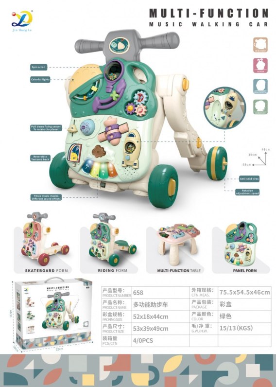 Interaktywny, wielofunkcyjny chodzik 4 w 1 z efektami dźwięku i światła, to zabawka dla dzieci od 18 -go miesiąca życia. Wykonany został z bezpiecznego dla dziecka tworzywa sztucznego, różnorodność kolorów przyciąga wzrok maluszka i zachęca do zabawy. Chodzik można przekształcić w deskorolkę, jeździk lub stolik multifunkcyjny. Zabawka zasilana jest bateriami typu 3 x AA 1,5V (brak w zestawie). Tryby zabawki: - tryb chodzika, - tryb deskorolki, - tryb jeździka, - tryb stolika multifunkcyjnego Specyfikacja zabawki 4 w 1 - dostosowanie wysokości chodzika, jeździka i deskorolki - możliwość obciążenia zabawki (zbiornik na wodę z tyłu), - blokada kół, - opony antypoślizgowe, - stabilna konstrukcja, Specyfikacja panel multifunkcyjny o tematyce kosmosu: - efekty światła * górny lewy brzeg z migającymi światełkami * podświetlone organki. - efekt dźwięku: * organki - muzyka, - kółeczko wypełnione kolorowymi małymi piłeczkami, - przekładanka z koralikami, - przekładanka z „x", - suwak wprowadzający w ruch kulę, - obrotowe elementy satelity, - ruchome koła zębate, - wyjmowana z panelu rakieta z obracającą się w środku kulą i małymi piłeczkami, - książeczka do przekładania. |