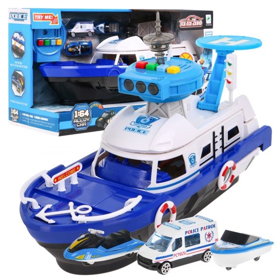 Interaktywne Policyjna łódź 2w1 dla dzieci 3+ Schowek na resoraki + 3 pojazdy + Światła Dźwięki