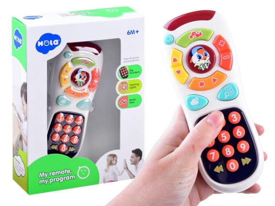 Pilot TV jest wyposażony w mnóstwo kolorowych, ciekawych przycisków, co zachęci każdego maluszka do zabawy.