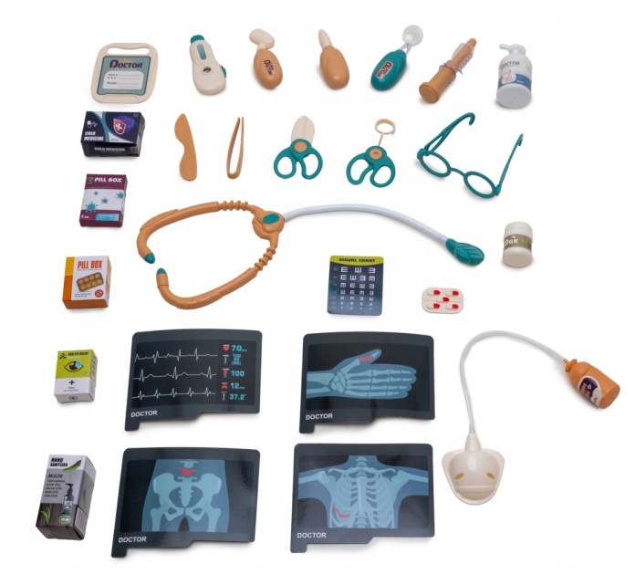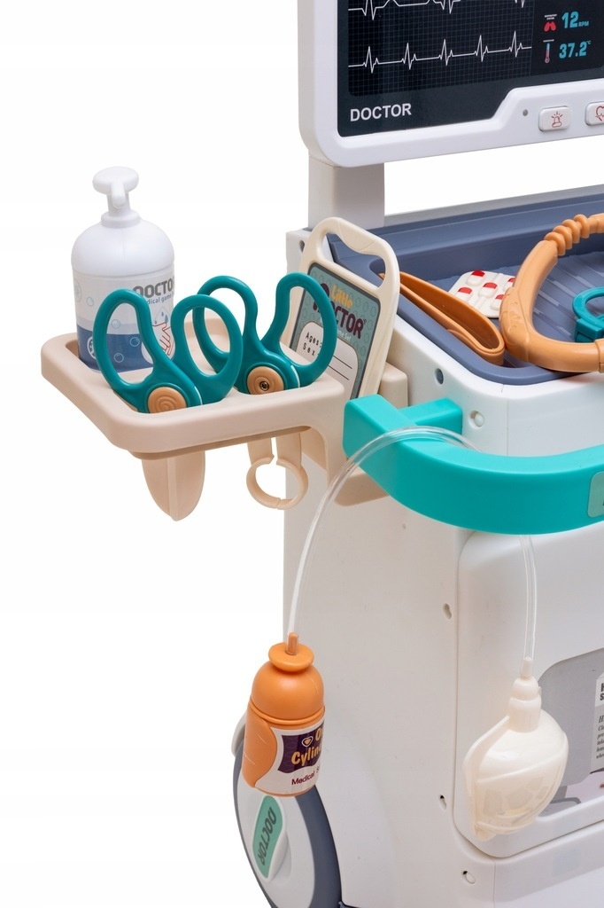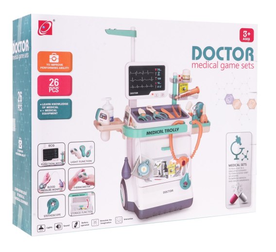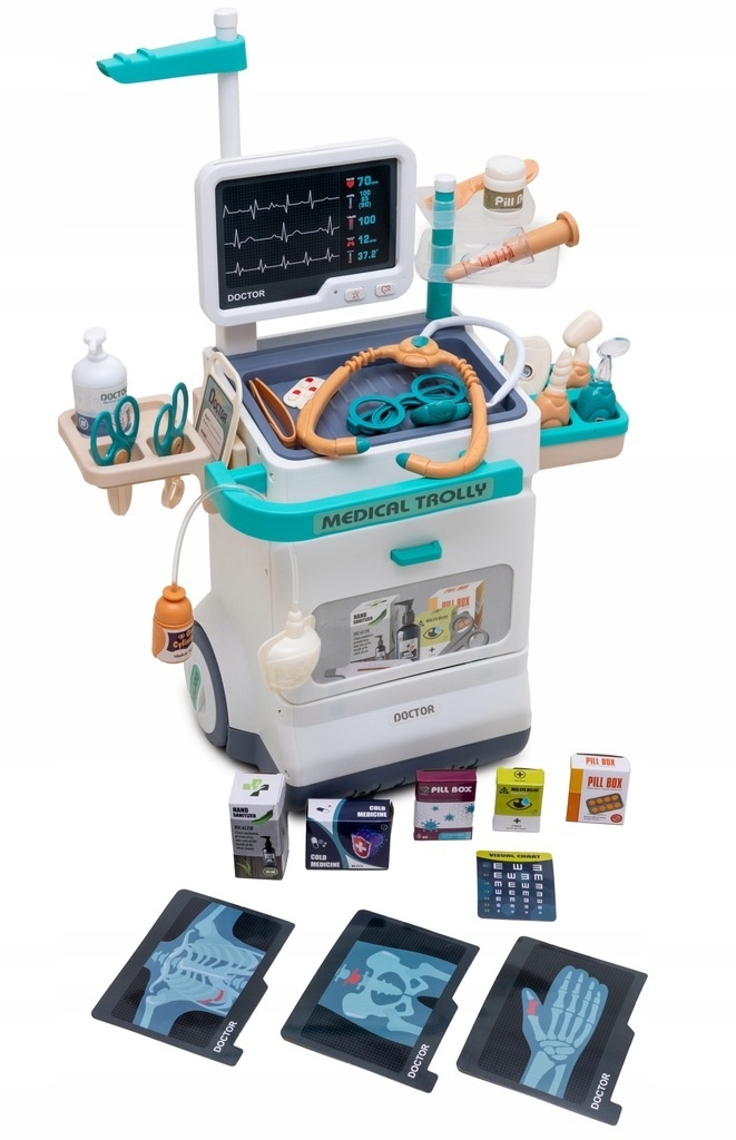 Z tym zestawem dziecko może się wcielić w rolę okulisty, internisty, kardiologa lub dentysty. Duży wózek medyczny, na którym możemy ułożyć wszystkie akcesoria medyczne, jest lekki i łatwo się go przemieszcza dzięki dwóm gładkim i dużym kółkom oraz poręcznemu uchwytowi. Duża ilość akcesoriów medycznych posiada interaktywne efekty dźwiękowe i świetlne, co dodaje atrakcyjności produktowi.