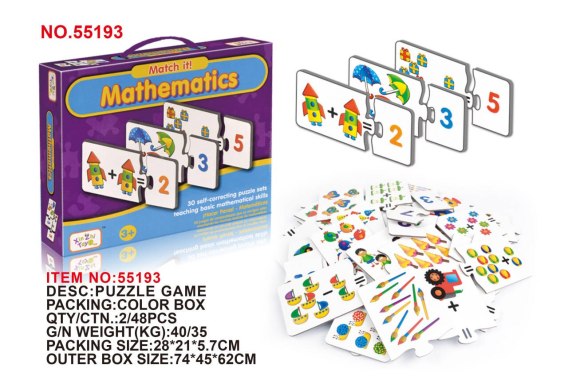 Gra edukacyjna, matematyczna Liczenie dla dzieci od trzeciego roku życia. Gra składa się z 30 puzzli, dzięki którym dziecko uczy się liczyć i dopasowywać kształty. Gra trenuje również koordynację ręka-oko, rozwija spostrzegawczość i koncentrację. Z jednej strony mamy zadanie matematyczne w postaci rysunków różnej ilości rzeczy i działania matematycznego np. rakieta dodać rakieta. Z drugiej strony, dziecko musi przypasować puzzel z cyfrą arabską odpowiadającą równaniu po lewej stronie. Gra znakomicie łączy w sobie naukę i zabawę.
