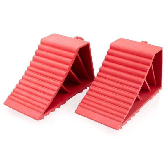 Praktyczny zestaw klinów hamulcowych pod koła samochodów i przyczep. Kliny stosuje się w celu zapobiegania niezamierzonemu stoczeniu się pojazdu. Każdy z klinów posiada uchwyt ułatwiający jego pozycjonowanie. Kliny zostały wykonane z termoplastycznej gumy dzięki czemu są lekkie i wytrzymałe.
