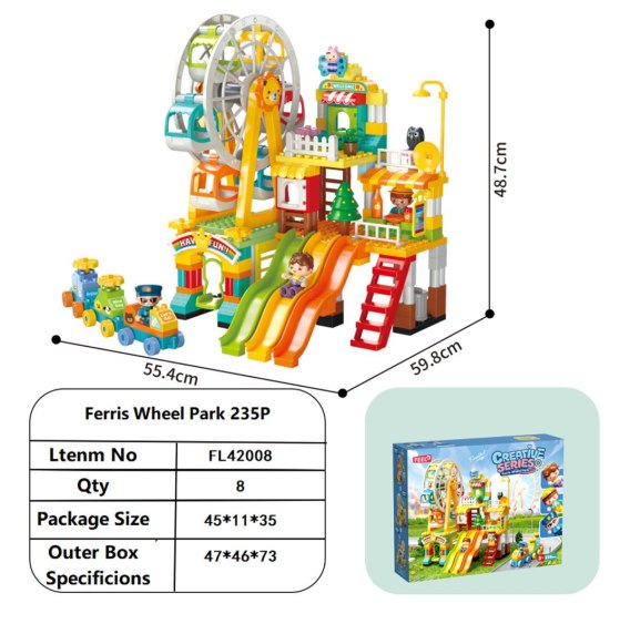 Zestaw klocków konstrukcyjnych do zbudowania wesołego miasteczka dla dzieci od trzeciego roku życia. Zestaw składa się z 235 elementów wykonanych z najlepszej jakości materiałów i bezpiecznych dla dzieci. Klocki przyciągają bogactwem kolorów i funkcyjnością. Wesołe miasteczko posiada obrotowe koło młyńskie, z otwieranymi wagonikami by można było w nich posadzić figurki, ruchomą huśtawkę i trzy zjeżdżalnie. Jest również kolejka z ruchomymi kółeczkami i figurką policjanta pilnującego porządku w wesołym miasteczku, oraz dwie figurki dzieci.