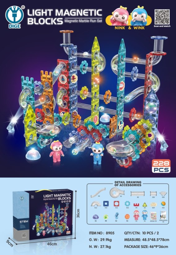 Zestaw kolorowych klocków magnetycznych dla dzieci od 3-go roku życia. Zestaw składa się z 228 elementów i pozwala na zbudowanie toru dla kulek o dowolnym układzie. Niektóre elementy zestawu zasilane są bateriami, a po włączeniu ich rozświetlają tor pulsującymi światłami, a zabawa robi się ciekawsza. Światełka pulsują w 3 trybach: szybkim, średnio szybkim i wolnym, można wybrać, który tryb będzie dla dziecka odpowiedni. Dodatkowo kilka kulek po potrząśnięciu mruga światełkami. W zestawie mamy też kilka kolorowych kapsuł, które świecą się i zmieniają kolory oraz kilka reflektorów LED. W sumie zestaw zasilany jest bateriami typu 12 x LR1130 1,5 V, 6 x LR41 1,5 V, 8 x CR1220 3 V. Wszystkie baterie znajdują się w zestawie. Klocki wykonane zostały z najlepszej jakości tworzywa, są gładkie i starannie wykonane. Łączymy je ze sobą za pomocą wbudowanych magnesów. Magnesy bardzo dobrze trzymają, zapewniając stabilność konstrukcji. W zestawie znajduje się obrazkowa instrukcja złożenia przykładowych torów. |