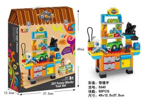 Zestaw klocków konstrukcyjnych do zbudowania warsztatu dla dzieci od 3-go roku życia. Klocki wykonane zostały z najlepszej jakości materiałów, są bezpieczne dla dziecka i bardzo kolorowe. Warsztat wyposażono w jedno autko, narzędzia - śrubokręt, klucz francuski, podnośnik a nawet maszynę z pistoletem do pompowania powietrza w koła. Cały zestaw składa się z 92 elementów. |