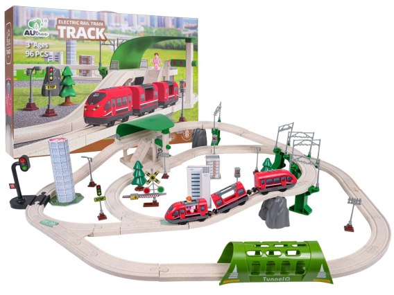 Interaktywna kolejka dla dzieci od trzeciego roku życia. Zestaw wykonano z bezpiecznych i trwałych materiałów, co gwarantuje mu niezawodność i długi okres użytkowania. W zestawie znajdują się tory, po którym porusza się pociąg, budynek stacji, tunel, jest też sygnalizacja świetlna. Na wyposażeniu mamy również budynki miejskie, znaki drogowe oraz figurkę. Ten zestaw daje wiele możliwości kreatywnej zabawy. Tunel zasilany jest bateriami typu 3 x AG13 (w zestawie), przejeżdżający przez niego pociąg uruchamia odgłosy jazdy pociągu i kolorowe mrugające światełka. Stacja kolejowa zasilana jest bateriami typu 3 x AG3 (w zestawie), posiada podświetlenie i wydaje odgłosy jazdy pociągu. Sygnalizacja świetlna zasilana jest bateriami typu 3 x AG3 (w zestawie), posiada efekty świetlne w postaci zmieniających się światełek. Pociąg zasilany jest bateriami typu 2 x AAA 1,5V (brak w zestawie), jeździ do przodu i do tyłu oraz wydaje odgłosy jazdy i ma podświetlane przednie reflektory.