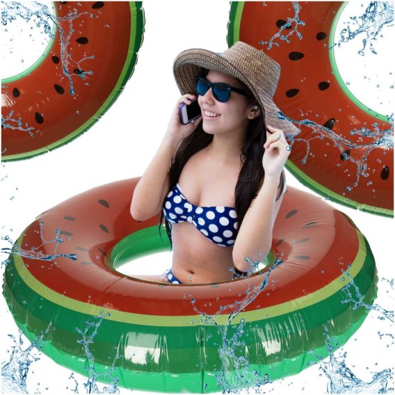 Kolorowe koło dmuchane w kształcie arbuza, wykonane z wysokiej jakości plastiku PCV, gwarantującego wytrzymałość.
