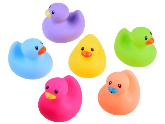 Sześć gumowych kaczek w różnych kolorachto zabawy w wodzie. Zestaw kolorowych, mięciutkich, gumowych kaczuszek zapewni mnóstwo radosnej zabawy podczas np. wieczornej kąpieli. Kaczuszki mają dziurawe dziubki, dzięki czemu można nabierać nimi wody i psikać się nią dopóki mama nie wtargnie do łazienki. Zabawa kolorowymi kaczkami, pozwoli na poznanie i utrwalenie kolorów. Wymyślanie przeróżnych kaczych historii, śpiewanie piosenki o kaczce dziwaczce itp, Wyobraźnia dzieci przecież nie ma końca!