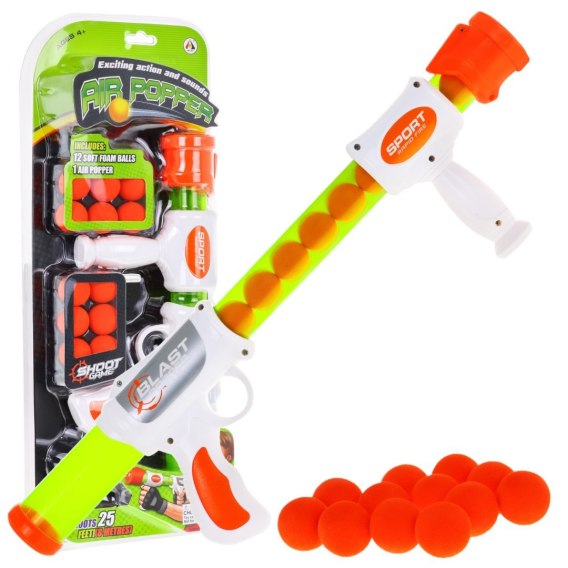 Ulubiona zabawka każdego chłopca, pistolet na kulki, to propozycja dla dzieci już od 4 - go roku życia. Zestaw zawiera pistolet i 12 miękkich kulek. Obsługa, pistoletu jest bardzo prosta, należy załadować kulki, rozciągnąć i ścisnąć wyrzutnię, wytworzy się wówczas ciśnienie, które spowoduje wystrzał kuli. Wystrzelone kulki lecą na odległość aż do 8 metrów. Zabawka nie wymaga użycia baterii, jest zasilana ludzką siłą. Na końcu lufy znajduje się gumowa uszczelka, która zapobiega samoistnemu wypadaniu kulek. |